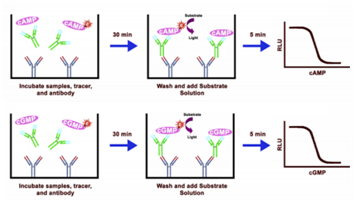 G蛋白是細(xì)胞內(nèi)的重要調(diào)控因子,參與細(xì)胞運動、代謝和轉(zhuǎn)錄等生理過程,它通過一系列膜結(jié)合受體觸發(fā)細(xì)胞內(nèi)的級聯(lián)反應(yīng)來參與調(diào)節(jié)各種細(xì)胞外信號。而調(diào)控G蛋白信號級聯(lián)反應(yīng)的關(guān)鍵是“第二信使”,即環(huán)磷酸腺苷(cAMP)和環(huán)磷酸鳥苷(cGMP)。這兩種分子的關(guān)鍵功能之一是激活鳥嘌呤交換因子(GEF),而GEF反過來又在G蛋白的活化中發(fā)揮作用。因此,檢測cAMP / cGMP水平,是研究細(xì)胞內(nèi)眾多信號通路必不可少的實驗之一。美國Cell Biolabs公司提供了一種穩(wěn)定、高效的檢測cAMP/cGMP濃度的試劑盒,其采用競爭ELISA的方法,檢測靈敏度可達(dá)1 pmol/mL,并且試劑盒特異性強(qiáng),不與其他第二信使發(fā)生顯著交叉反應(yīng),適用于檢測的樣品類型廣泛,包括細(xì)胞/組織裂解液、唾液、尿液、血清和細(xì)胞上清等。