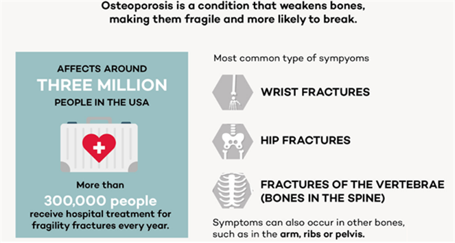 骨質(zhì)疏松癥是一種以骨密度降低為特征的肌肉骨骼系統(tǒng)疾病。肌肉骨骼系統(tǒng)是由骨骼、肌肉和相關(guān)元素,如軟骨、結(jié)締組織和關(guān)節(jié)所組成。它為身體提供形態(tài)、支撐和穩(wěn)定性,并使其運(yùn)動。骨密度的降低會導(dǎo)致骨骼的收縮,從而會導(dǎo)致骨骼變得脆弱,增加骨折的風(fēng)險。