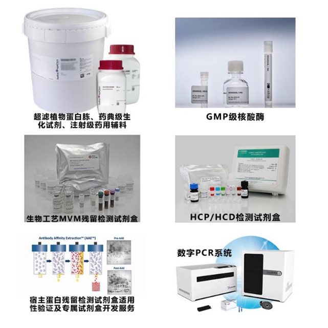 - 質(zhì)量檢測——HCP檢測試劑盒,Protein A檢測試劑盒,HCD檢測試劑盒,MVM工藝病毒清除檢測試劑盒,核酸酶檢測試劑盒,另有各類二抗、底物、免疫學(xué)輔助試劑等;