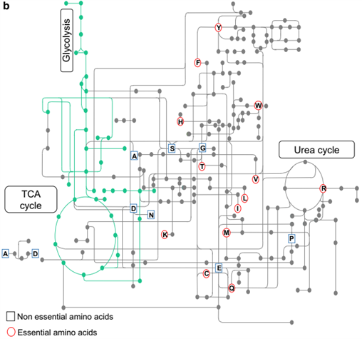 下圖展示了CHO細(xì)胞中氨基酸參與的細(xì)胞內(nèi)代謝途徑(綠色線條表示碳代謝途徑,單字母表示氨基酸)。