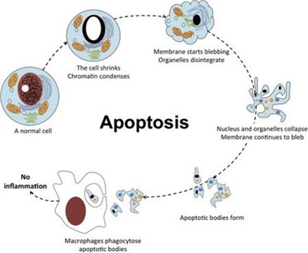 凋亡的特征具有明顯的形態(tài)變化以及特定caspase和線粒體控制通路的激活。凋亡細(xì)胞出現(xiàn)細(xì)胞體積縮小,與周?chē)?xì)胞脫離,然后細(xì)胞質(zhì)密度增加,通透性改變,染色質(zhì)濃縮和核碎裂,并顯示出稱(chēng)為膜起泡的典型變形的膜,膜內(nèi)側(cè)磷酯酰絲氨酸外翻到膜表面,胞膜結(jié)構(gòu)仍然完整,無(wú)內(nèi)容物外溢,不引起周?chē)难装Y反映。膜起泡可導(dǎo)致在垂死細(xì)胞邊緣形成小囊泡,稱(chēng)為凋亡小體。凋亡小體可迅速被周?chē)耐淌杉?xì)胞吞噬。凋亡可以通過(guò)內(nèi)在或外在通路觸發(fā),內(nèi)在通路可以通過(guò)細(xì)胞應(yīng)激、DNA損傷、發(fā)育信號(hào)、存活因子缺失被激活,外在通路則是通過(guò)檢測(cè)到來(lái)自其他細(xì)胞的細(xì)胞外死亡信號(hào)來(lái)觸發(fā)的。