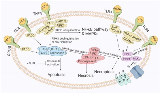 Fas又稱(chēng)CD95,是由325個(gè)氨基酸組成的受體分子,它與其配體FASLG(CD178)結(jié)合可以啟動(dòng)凋亡信號(hào)的轉(zhuǎn)導(dǎo)引起細(xì)胞凋亡。Fas具有特殊的死亡結(jié)構(gòu)域(DD,death domain),三聚化的Fas和FASLG結(jié)合后,使三個(gè)DD相聚成簇,吸引了胞漿中另一種帶有相同死亡結(jié)構(gòu)域的蛋白FADD。FADD是死亡信號(hào)轉(zhuǎn)錄中的一個(gè)連接蛋白,它由兩部分組成:C端(DD結(jié)構(gòu)域)和N端(DED)部分。C端與Fas的DD結(jié)構(gòu)域結(jié)合,N端連接另一個(gè)帶有DED的后續(xù)成分,由此引起N端DED隨即與無(wú)活性的caspase-8發(fā)生反應(yīng),進(jìn)而引起caspases級(jí)聯(lián)反應(yīng),誘發(fā)細(xì)胞凋亡。Fas/FASLG涉及許多癌癥和免疫疾病的發(fā)病機(jī)制,如多發(fā)性硬化癥[2]。