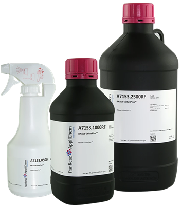 在mRNA疫苗的生產(chǎn)以及其他與mRNA相關(guān)的生物制品中,RNase污染的清除尤為重要,德國Applichem研發(fā)的RNase-ExitusPlus?是一種非堿性、無腐蝕性且無致癌性的新型RNase清除液,它對RNase污染物具有很好的清除性能,是適用于任何表面的即用型RNase污染清除液,可用于實驗室表面的清潔,如實驗操作臺、電泳設(shè)備、移液器和反應(yīng)管等。