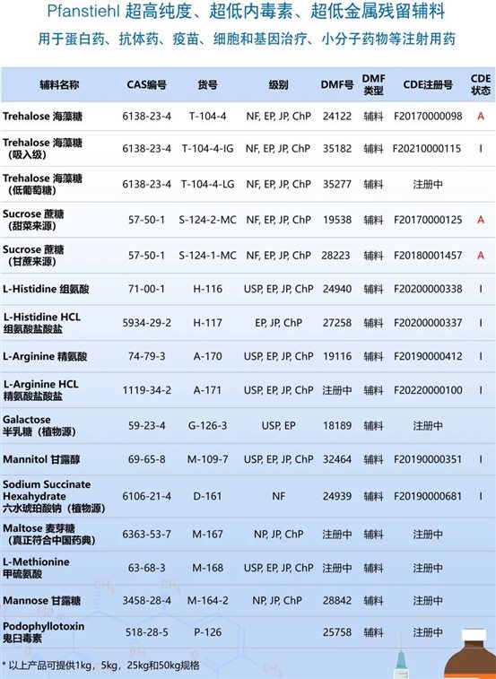 本次論壇西美杰將重點(diǎn)展出Pfanstiehl將高純度低內(nèi)毒素注射用糖類及氨基酸等十余種輔料產(chǎn)品。