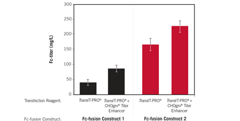 CHOgro? High Yield Expression System系統(tǒng)中關(guān)鍵組分TransIT-PRO?轉(zhuǎn)染試劑,通過優(yōu)化瞬時(shí)轉(zhuǎn)染效率,可進(jìn)一步提高目標(biāo)蛋白/抗體產(chǎn)量。同樣的,該轉(zhuǎn)染試劑不含動(dòng)物源成分,可以與懸浮CHO或者293細(xì)胞搭配使用,并且可以兼容不同種類的培養(yǎng)基,旨在提高生產(chǎn)蛋白/抗體產(chǎn)量及穩(wěn)定性。