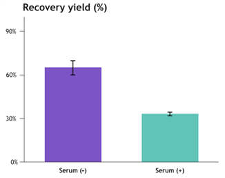圖4. 有無血清培養(yǎng)體系慢病毒回收率:純化后樣品中慢病毒/病毒原液%。