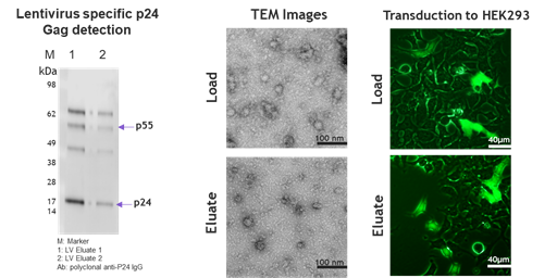 圖6. 通過WB、電鏡和細(xì)胞感染實驗分別對比了Nereus LentiHERO? 純化前后慢病毒結(jié)構(gòu)蛋白的完整性、顆粒形狀大小與感染活力均未受到顯著影響。