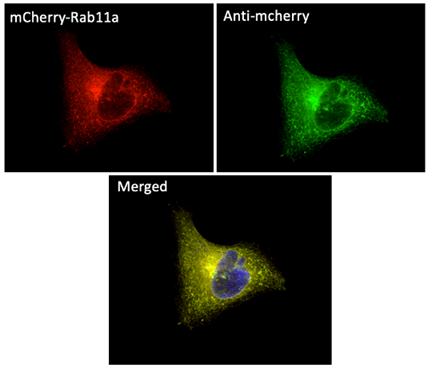 MCR細胞轉染表達mCherry-Rab11a后用甲醇固定并用1/250稀釋的anti-Rab11a抗體和anti-mCherry抗體做免疫熒光結果