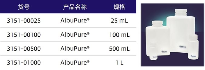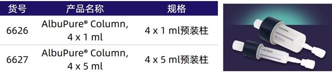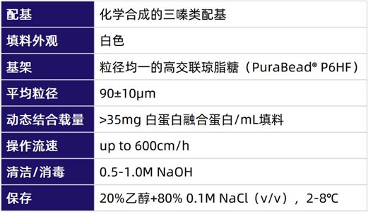 AlbuPure®是Astrea Bioseparations和Albumedix公司合作開(kāi)發(fā)的白蛋白親和層析填料,填料基架是粒徑均一的高交聯(lián)瓊脂糖,配基是合成的三嗪化合物,具體高流速、高動(dòng)態(tài)結(jié)合載量、強(qiáng)化學(xué)耐受性等特點(diǎn),主要用于白蛋白融合蛋白的純化。AlbuPure®的性能參數(shù)如下表所示。