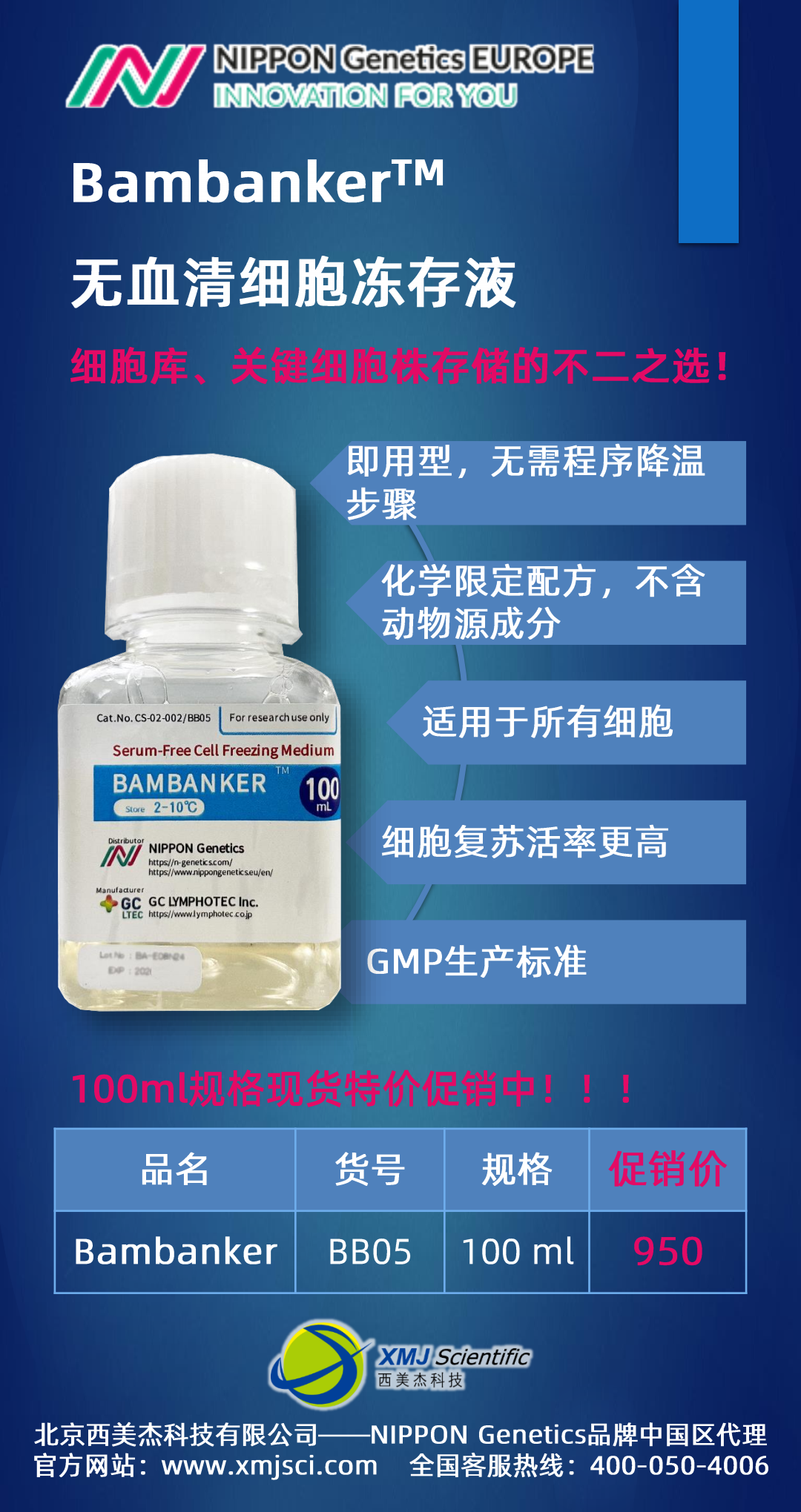 Bambanker?無血清細胞凍存液現(xiàn)貨促銷100ml特價950元