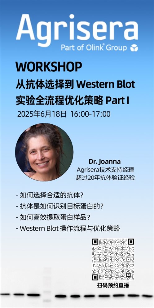 Western Blot實驗效率與結果的可靠性,很大程度上取決于對抗體特性的理解、正確的選擇以及實驗流程的優(yōu)化。為解決WB實驗過程中的常見問題,Agrisera技術專家Joanna博士將為大家?guī)?/span>WB全流程優(yōu)化系列講座,本系列講座包含兩次線上直播課程,6月18日下午4點直播第一次課程:從抗體選擇到WB全流程優(yōu)化策略,深度解析Western Blot技術的關鍵環(huán)節(jié),為您提供專業(yè)的優(yōu)化方案,歡迎大家提前報名預約。