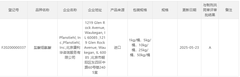 “ 熱烈祝賀Pfanstiehl品牌注射級鹽酸組氨酸H-117 CDE注冊登記號F20200000337已激活!”
