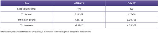 篩選裝置上樣量20ml,測(cè)得填料載量為3E+8 IU/ml。