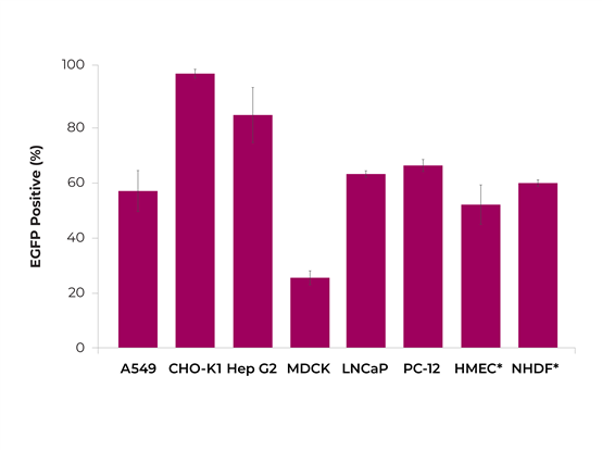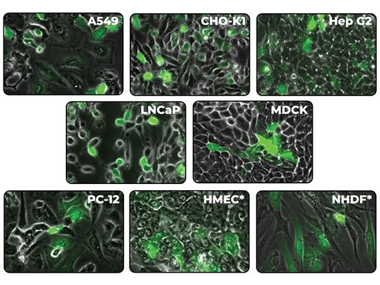TransIT-X2®具備卓越的廣譜轉(zhuǎn)染效率,在41種細胞系的對比實驗中,于 36 種細胞系中實現(xiàn)了優(yōu)于或等同于常見脂質(zhì)體轉(zhuǎn)染試劑的熒光素酶表達;其中17種細胞系的表達量高出常見脂質(zhì)體轉(zhuǎn)染試劑表達量2倍以上。