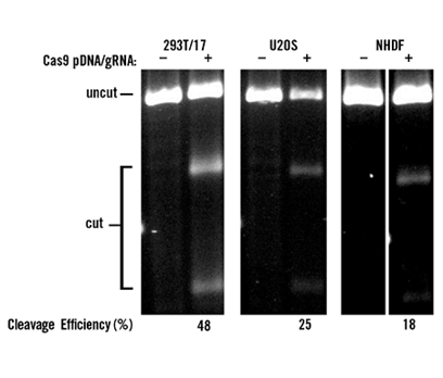 The TransIT-X2? Dynamic Delivery System (2 μl/well in 24-well plates, Mirus Bio) was used to co-transfect 0.5 μg of plasmid DNA (expressing Cas9 protein) and 50 nM of 2-part gRNA (targeting the PPIB gene) into HEK293T/17, U2OS, and NHDF cells. At 48 hours post-transfection, T7E1 assay was performed to verify the cleavage efficiency.