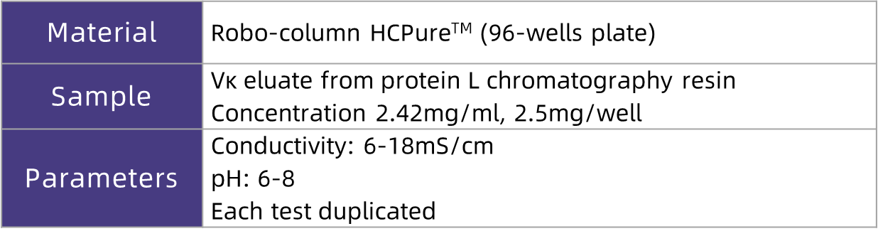 In this application case, researchers used E. coli to express the nanobody Vκ. The harvest was first purified via Protein L affinity chromatography. After neutralization, the eluate was adjusted to different pH values (6.0–8.0) and conductivities (6–18 mS/cm). Subsequently, the sample was loaded onto HCPure? in flow-through mode. The flow-through and wash fractions were collected, and the contents of Vκ and HCP were detected to explore the optimal loading conditions for HCPure?. The test conditions are shown in the table below: