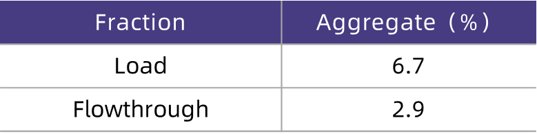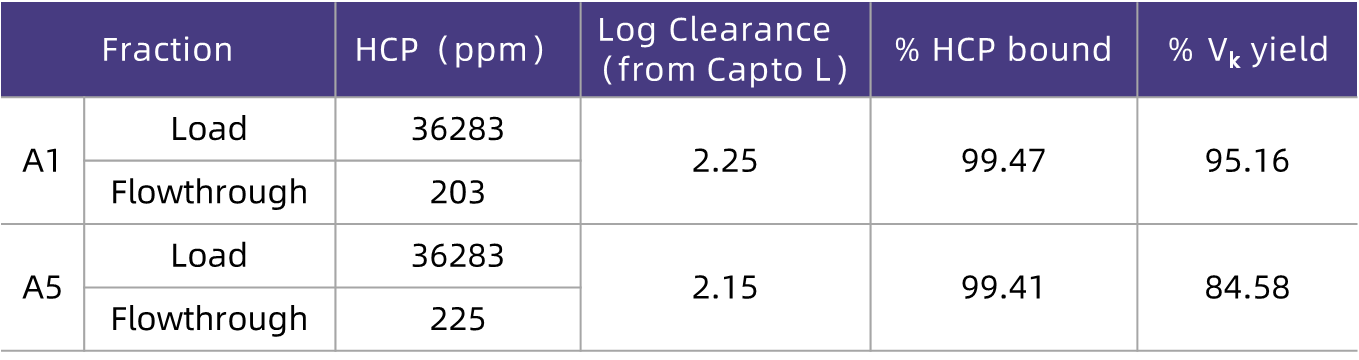As can be seen from the test results in Table 3, HCPure? can effectively remove HCP from the loading feed solution (with an average removal rate of 84%) over a wide range of loading pH and conductivity, while maintaining a high recovery rate of the target molecule (with an average of 87%). In addition, since the condition of pH 6.0 and conductivity 12 mS/cm corresponds to the initial neutralized eluate from affinity chromatography, the feed solution can be directly loaded onto HCPure? after affinity chromatography without adjustment or buffer exchange. This not only maintains excellent recovery rate and HCP removal efficiency but also significantly saves process time and costs.